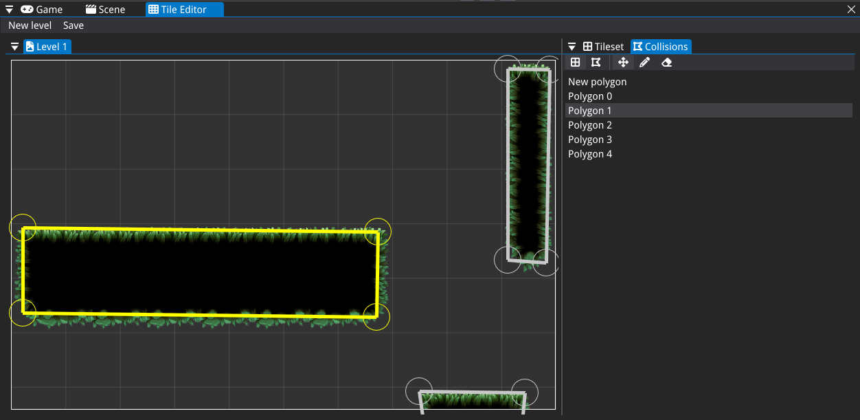 The Collision Editor facilitates the creation of polygon-based collision shapes. Users can define these shapes by placing points to form polygons, completing the shape upon connecting to the starting point. The editor also offers functionality to select existing polygons and modify them by adding, moving, or removing points, providing flexibility in collision design.